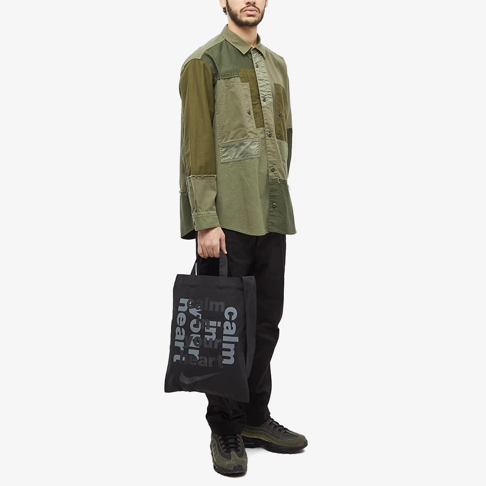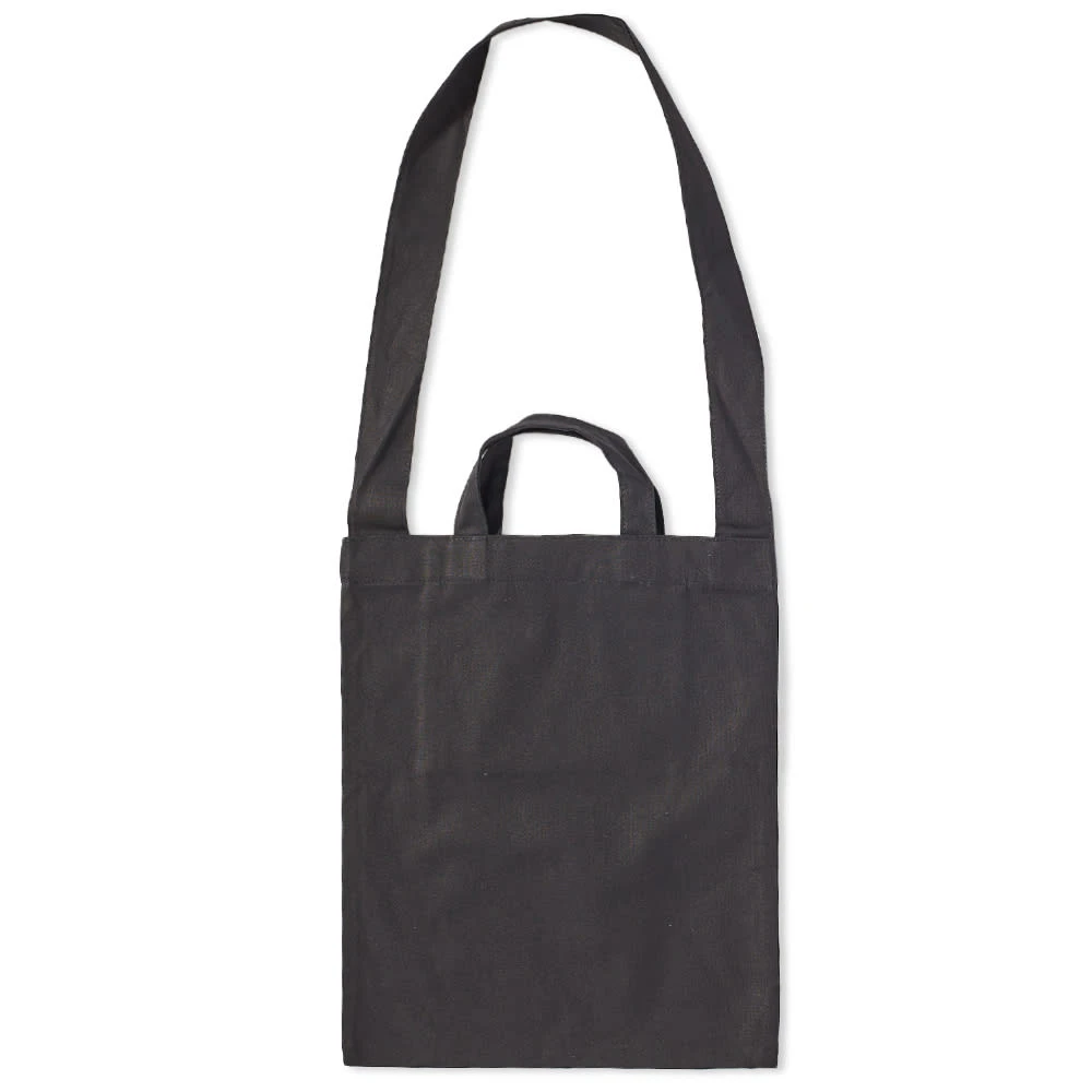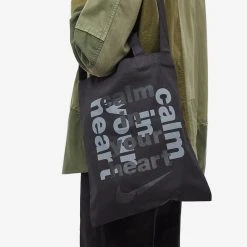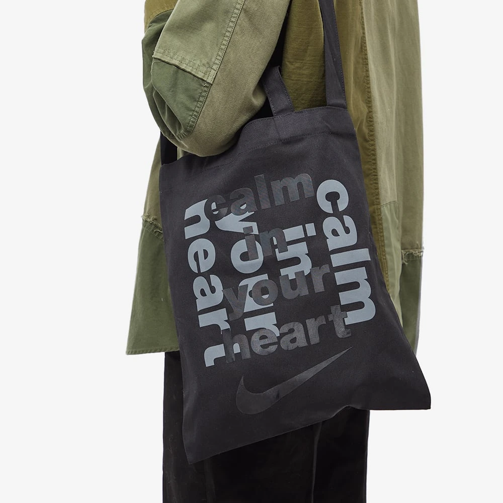 Rei Kawakubo’s diffusion line Comme Des Garçons Black continues its ongoing collaboration with Nike, combining a dark aesthetic with forward-thinking on the go staples. The duo prints this tote with the iconic Swoosh and “Love Thy Neighbour” slogan.