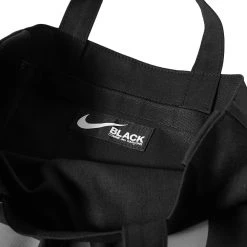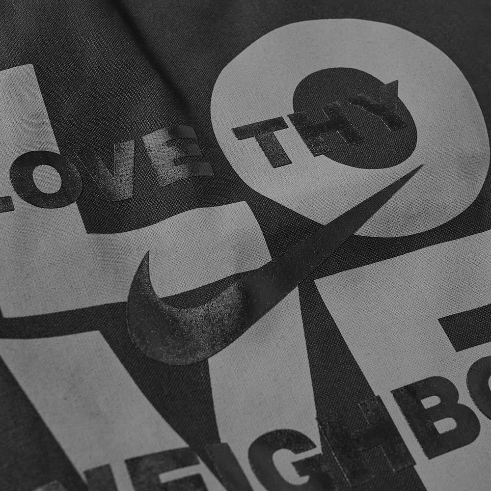 Comme Des Garçons’ Black line was founded by Rei Kawakubo in 2009 in response to The Great Recession. CDG Black and Nike come together again to create a collection of updated basics, including the Love Thy Neighbour Tote. This contemporary tote bag calls for a more caring world through the biblical quote ‘Love Thy Neighbour’, which forms the background for Nike’s iconic swoosh.
