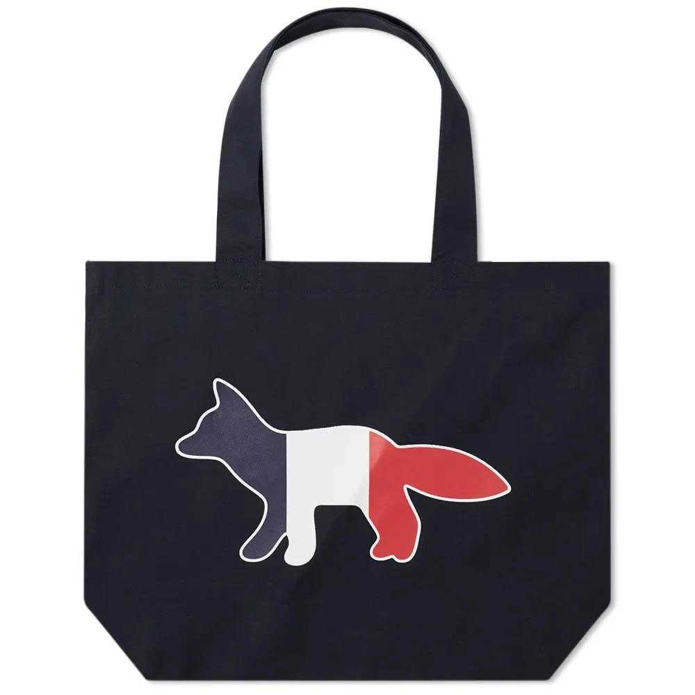 Maison Kitsuné celebrates its French heritage with this navy blue tote bag. It’s crafted from city-ready, cotton-blend canvas and decorated with a large tricolour version of the label’s signature fox motif on the front.