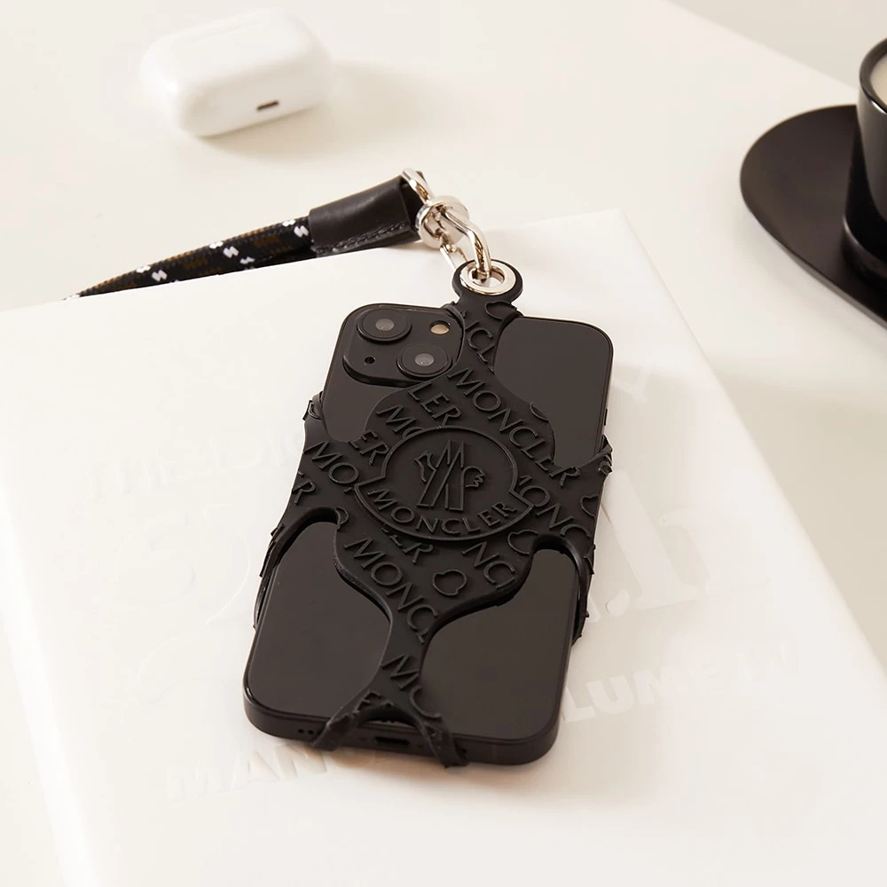 Luxury fashion house Moncler draws inspiration from the great outdoors to create this black lanyard phone case – styled with a detachable rock climbing-inspired rope strap with a smooth leather trim. It’s crafted from silicone for optimal durability with distinctive cut-out detailing, then complete with signature embossed branding.
