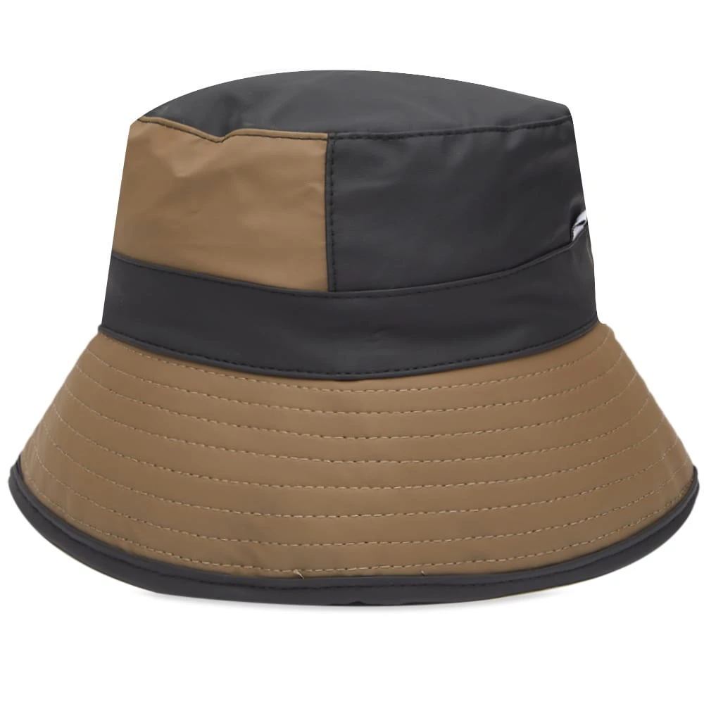 A headwear icon. The RAINS black and brown bucket hat is modernised with a lower rim showing a more vertical shape. Made from waterproof material it’s perfect for festivals, dog walking and everything in between.