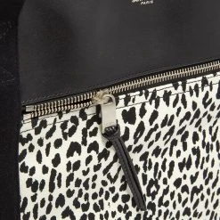 Leopard print is a recurring features in Saint Laurent’s AW20 collection, particularly across accessories. Cotton canvas covered in a monochromatic version forms the bottom panel of this tote bag, while the top trim is lightly grained black leather. Both the front and interior pockets fasten with silver-toned hardware, to match the printed foil branding.