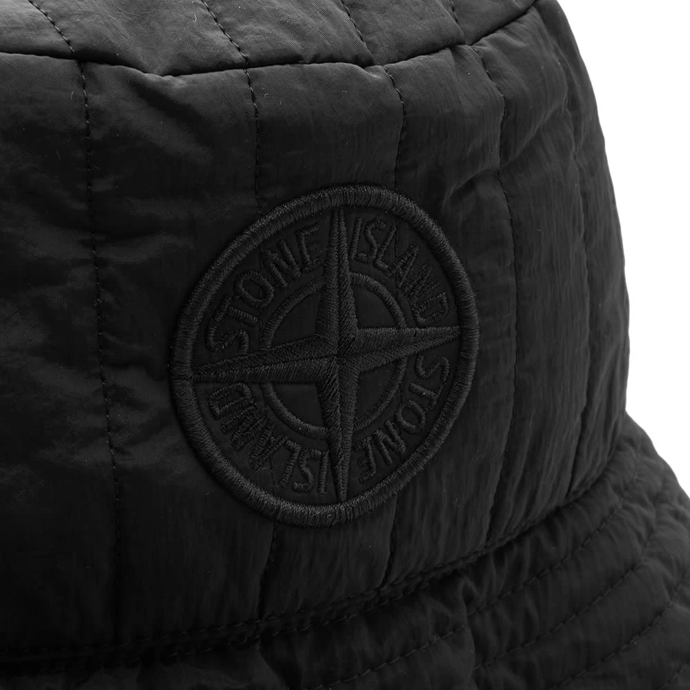 With a focus on sustainability, this black Stone Island bucket hat is made in a new responsible iridescent Nylon Metal fabric. Crafted with a inside removable ear protection piece and adjustable stretch nylon cord. Finished with embroidery of the brands compass logo on the crown.